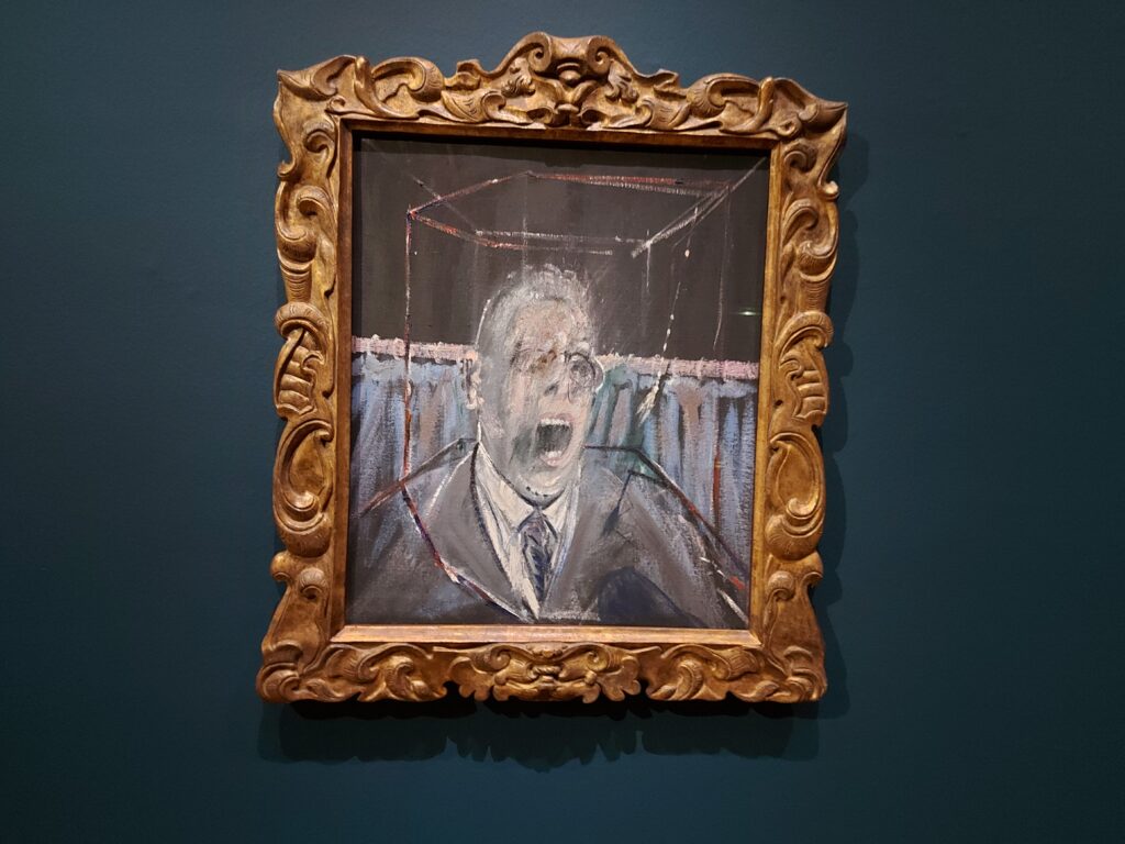 ‘Het feit dat Bacon is afgebeeld inThe Colony Room I – naast Belcher, al steunend op de bar onderstreept de centrale rol die hij speelde in het artistiek-intellectuele milieu van Soho. Je zou kunnenstellen dat zijn schilderijen evengoed gaan over de gemeenschappen en relaties waar hij destijds mee in aanraking kwam in nachtclubs, bars en andere openbare gelegenheden. In tegenstelling tot Andrews had Bacon echter meestal de neiging om de mensen die zich daar ophielden individueel af te beelden in zijn schilderijen. Zo zien we in Man in Blu I (1954), de eerste uit een serie van zeven schilderijen, een man in pak; hij leunt tegen de bar, met zijn armen over elkaar en zijn hoofd op zij gedraaid. Geïnspireerd op een ontmoeting tussen Bacon en een man in een bar in Henley-on-Thames, lijkt het schilderij te refereren aan het fenomeen ‘cruisen’, waarbij mannen in publieke ruimtes op zoek gaan nar losse seksuele contacten met andere mannen. De blik van de man verschuift op ieder opeenvolgend doek. Zo kijkt hij eerst van ons weg, dan om zich heen en tenslotte rechtstreeks naar ons de toeschouwer – een nabootsing van van het voor cruisen karakteristieke proces van blikken uitwisselen en andere non-verbale communicatie. Dit soort verhulde praktijken waren voor queer mannen van groot belang waarin de morele paniek over homoseksualiteit een hoogtepunt had bereikt in Groot-Brittanië, en er streng toezicht was op openlijke uitingen daarvan. Hoewel hij op het eerste gezicht geïsoleerd lijkt, verwijst hij naar de Man in Blue I dus ook naar de clandestiene, maar rijkgeschakeerde vormen van solidariteit en contact tussen mannen. In de jaren nadat dit schilderij werd gemaakt, kwamen er publieke discussies op gang over het decriminaliseren van homoseksualiteit, waarbij de nadruk lag op de figuur van de ‘respectable’ homoseksueel – afkomstig uit de middenklasse en met een mannelijk voorkomen – die zijn seksualiteit beleefde in de huiselijke ‘privésfeer’. Bacon zelf ging zich in zijn kunst vervolgens vragen stellen over de verschillende vormen die een ‘homoseksueel leven’ ook zou kunnen aannemen in Groot-Brittanië, zowel publiek als privé.’